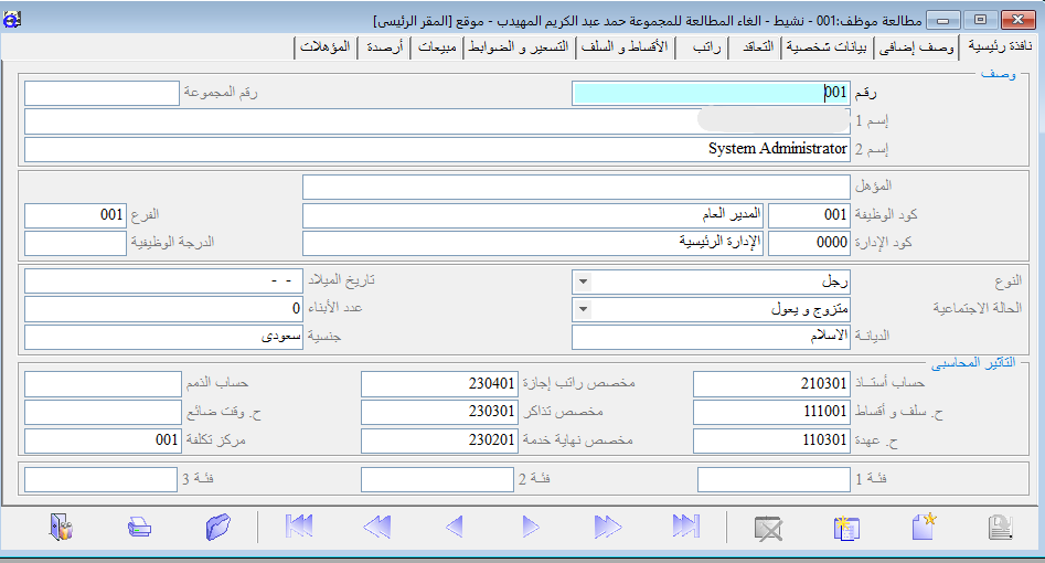 يتيح أسواق6 معلومات شاملة عن كل موظف تمثل حجر الأساس للتعامل معه ويسمح هذا الملف بإصدار العديد من التقارير التي تخص المنشأة وعلاقاتها بالجهات الحكومية والرقابية